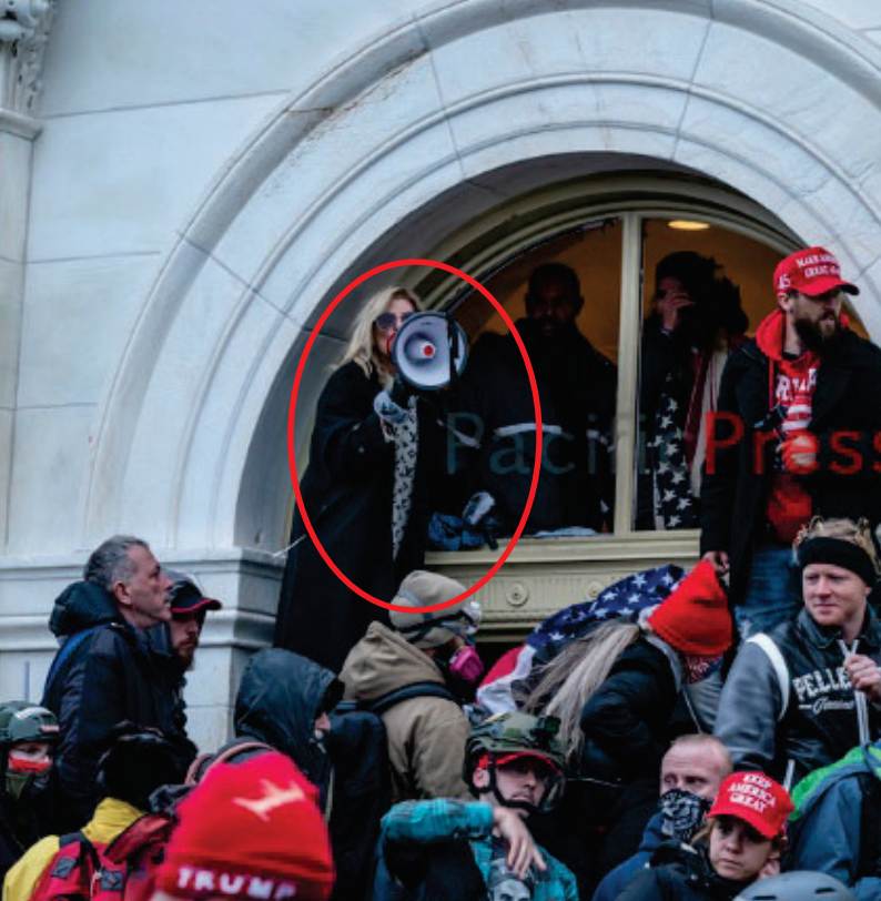 *FBI says she used a bullhorn to exhort rioters to storm Capitol (while wearing Louis Vuitton sweater).