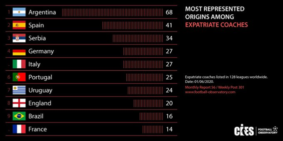 Este gráfico del CIES Football muestra el número de entrenadores de cada país entrenando fuera de casa. Lo de Francia es irrisorio. Solo hay 14 entrenadores actualmente franceses entrenando fuera de la Ligue 1 y solo Zidane en una top-5 europea. Dato brutal.