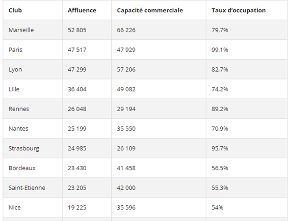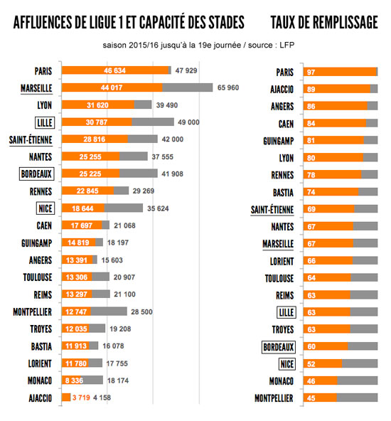 Aquí os dejo un gráfico de 2015-2016 de Le Monde de la afluencia de los estadios en Francia y su capacidad. El único que lo conseguía llenar era el PSG y fijaos en Burdeos, Niza, Lille, que tenían nuevo estadio y ahora, antes de la pandemia, recibían menos gente. Tremendo.