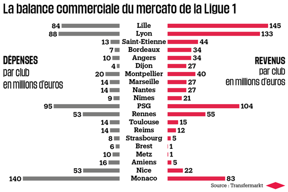 Este gráfico de Liberation es brillante de 2019. Fijaos lo poco que gastan los clubes de la Ligue 1 en general. Todos tienen una gran cantidad de ingresos en ventas de sus grandes jugadores, pero no fichan. Hay miedo a invertir por las altas cargas salariales e impedimentos.