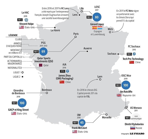 Aquí os dejo un mapa de inversores en la Ligue 1 de 2019 que ha variado, pero para explicar que en Francia apenas hay pegas para invertir, aunque con trabas fiscales que impiden desarrollo de equipos. En Alemania, te obligan a tener el 49% de las acciones, por ejemplo.