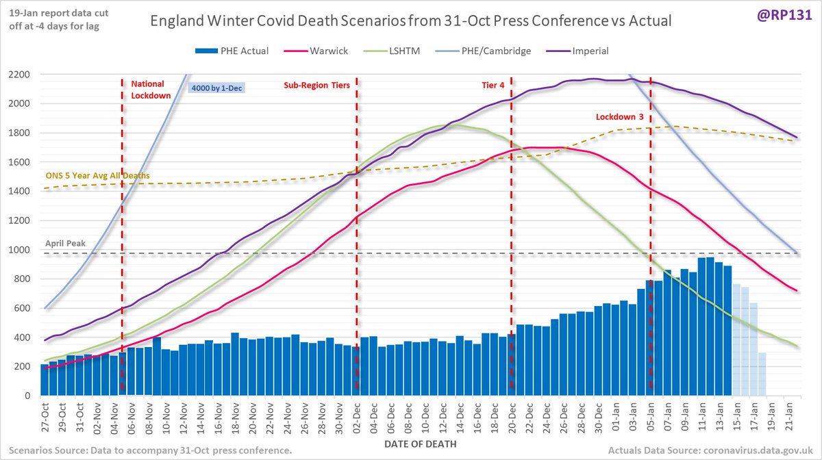 Updated chart from 31-Oct lockdown press conference with latest England date-of-death data (latest 4 days faded out for lag):