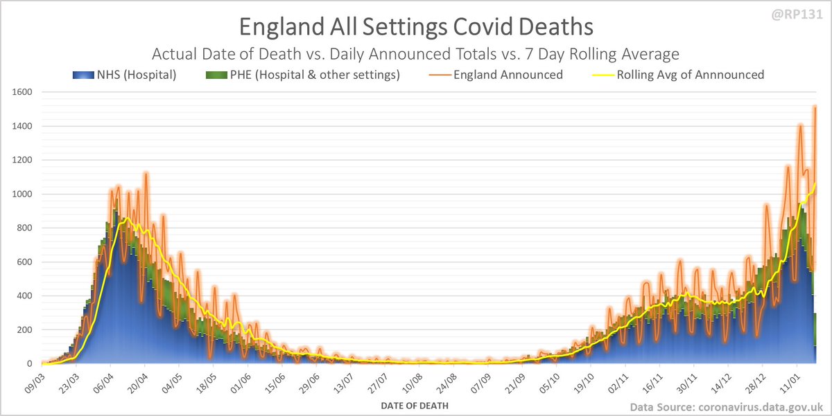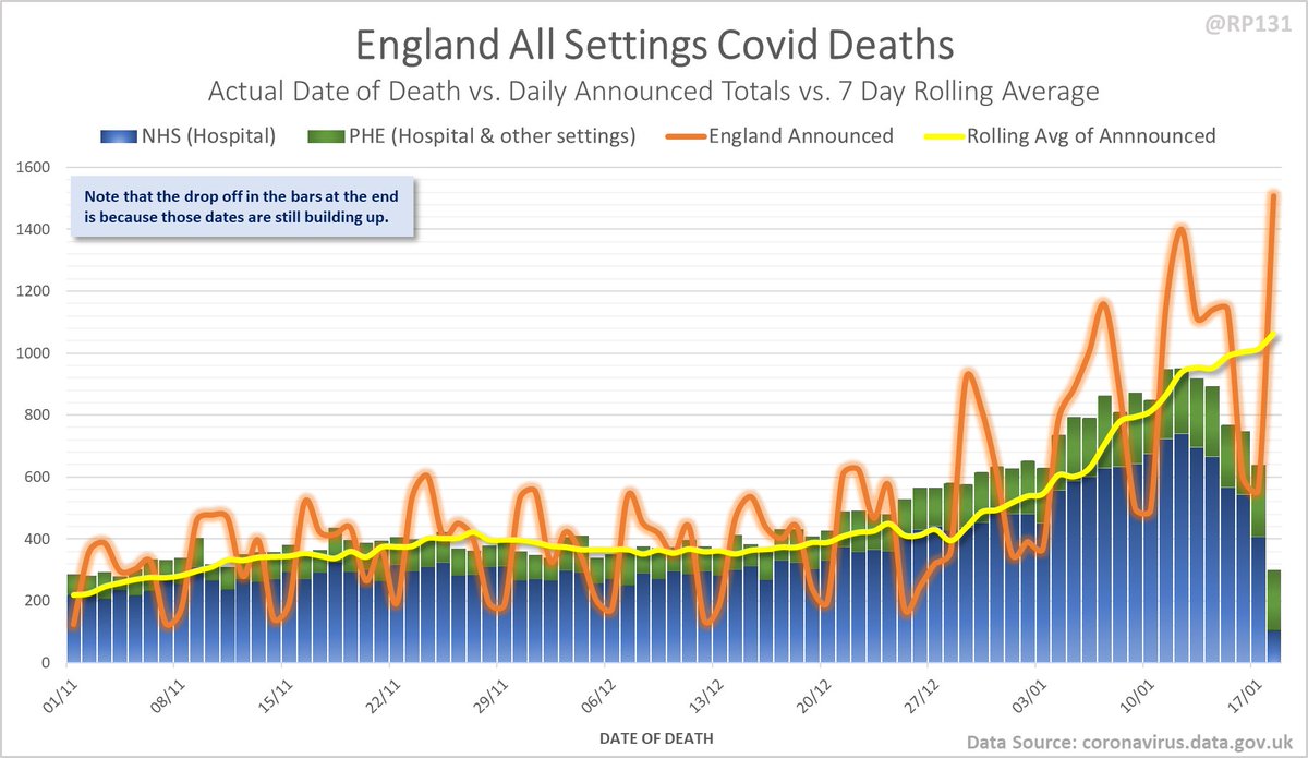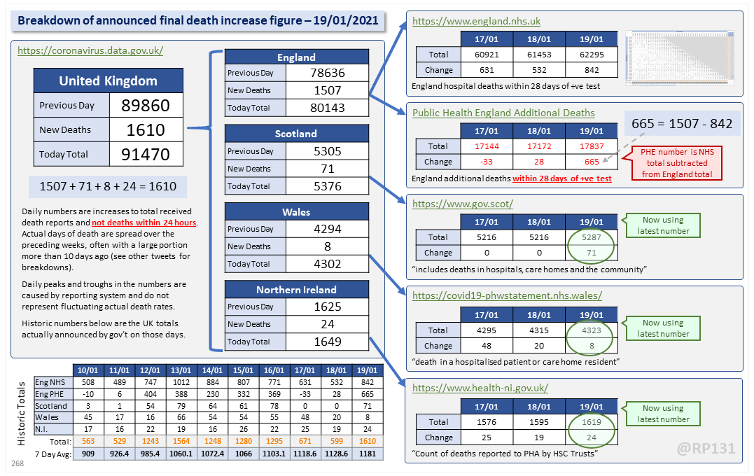 Dashboard for 19-Jan to explain where the #covid19uk total death increase figure of 1610 actually comes from. The PHE dataset merge resulted in a net of 665 additional deaths today. This moves the 7 day rolling average up by 52.4 to 1181.