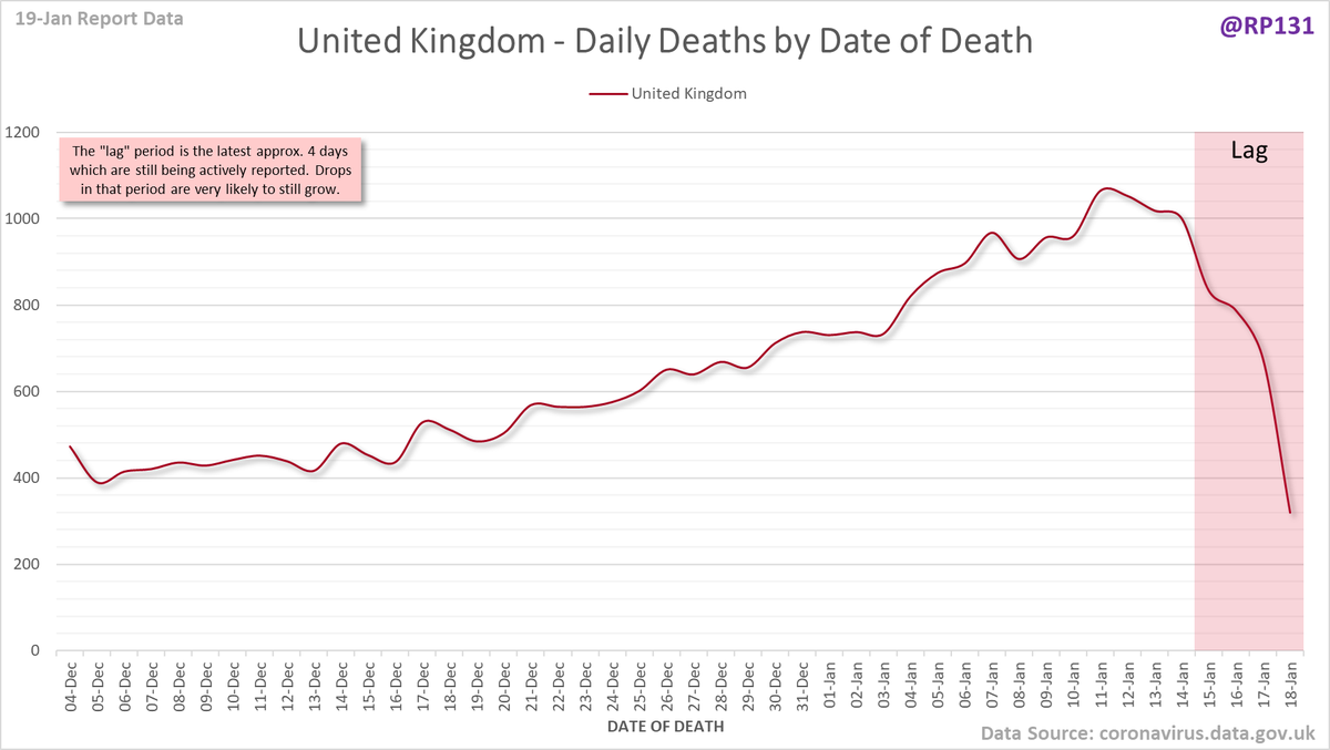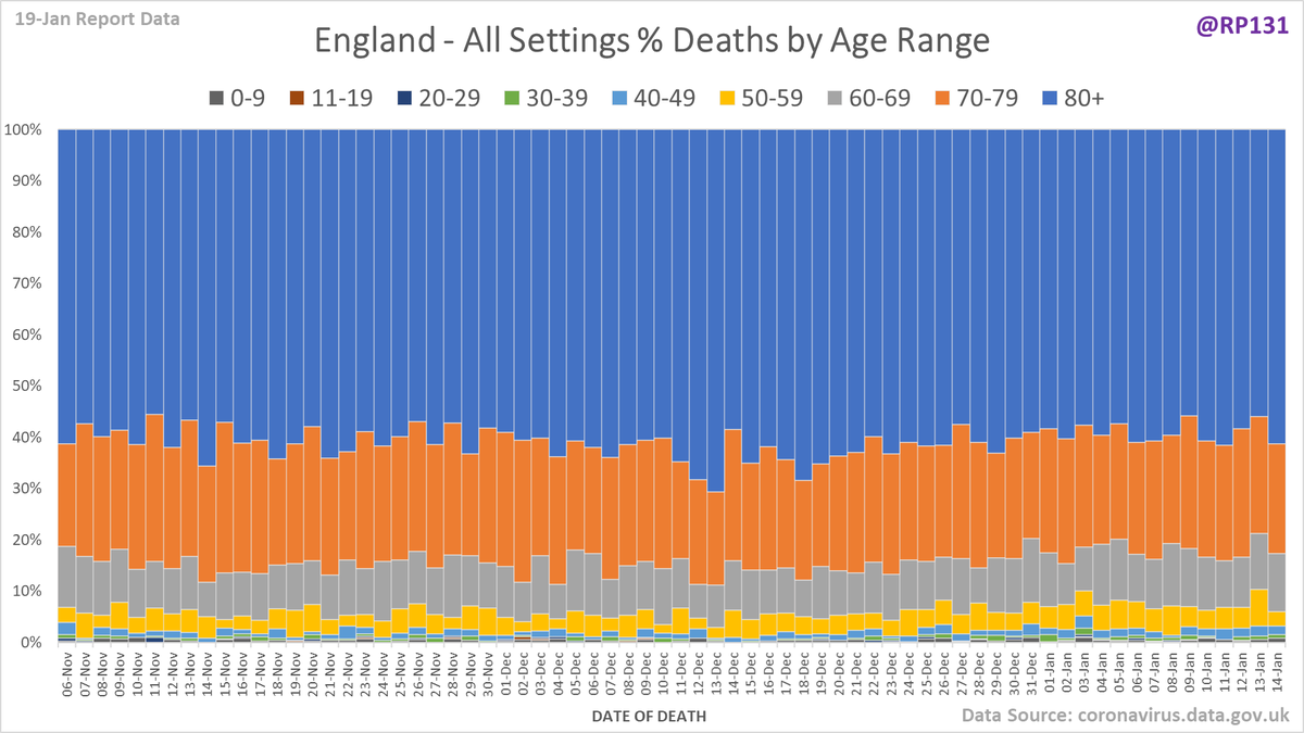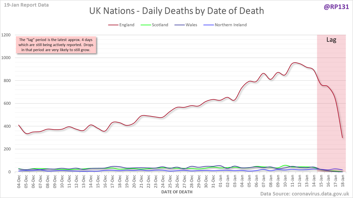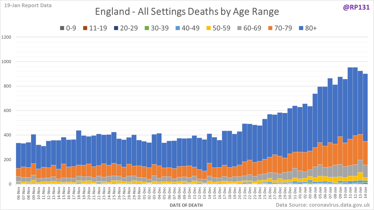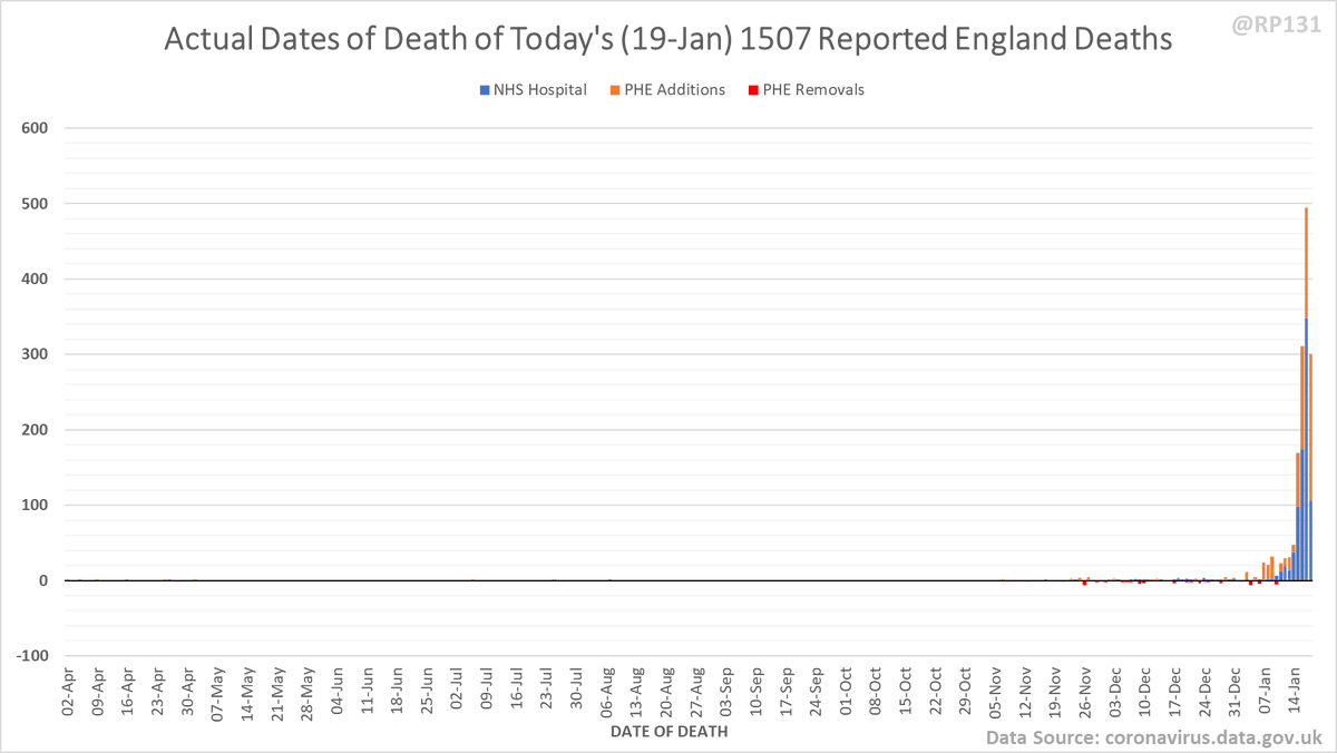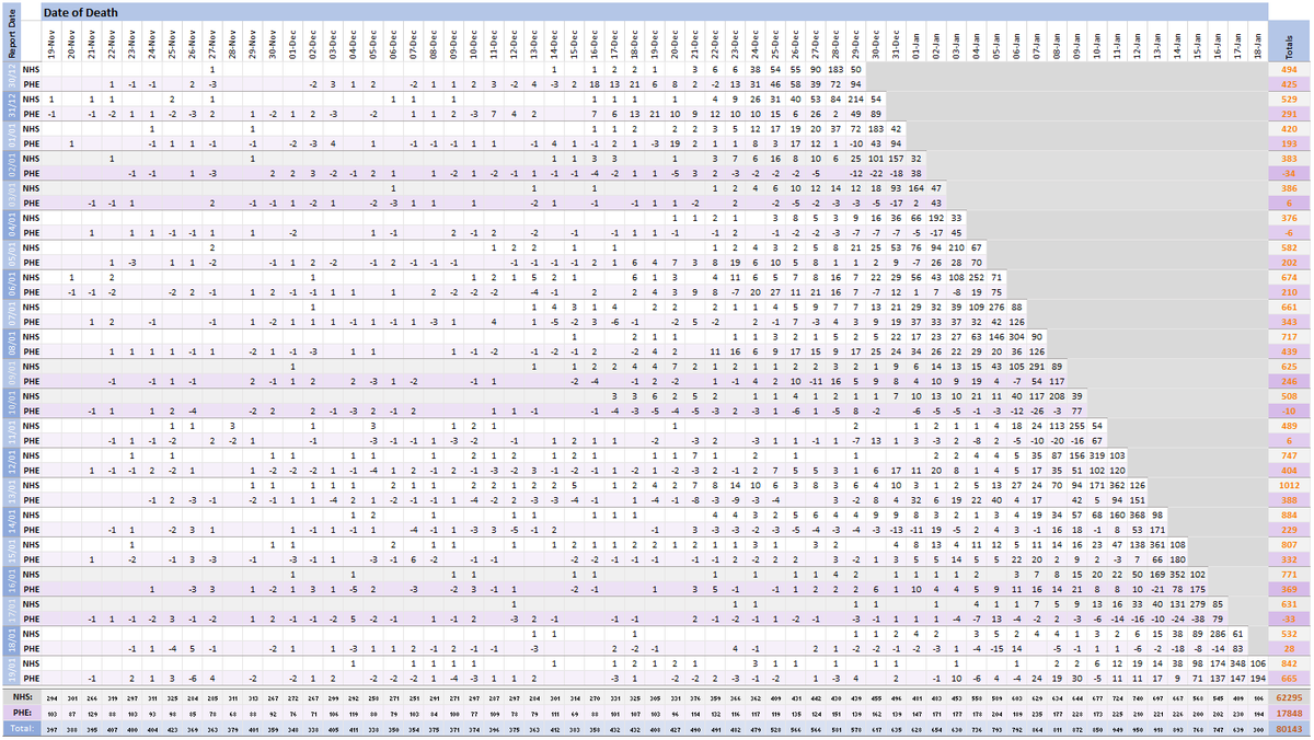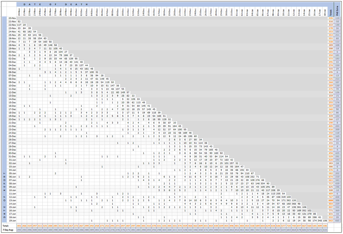 Pivot for 19-Jan to show breakdown of both 842 NHS and 665 (net) PHE deaths by date of death. The negatives are a combination of date of death corrections and accounting for NHS deaths that were already known to PHE. Small version for twitter first: