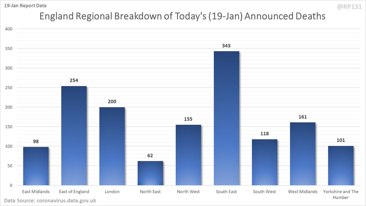 Breakdown of today's newly reported England deaths by region. Note that this data (1492) doesn't always quite add up to the total England number they announce (1507) possibly due to data merging issues. However I still think it's useful to see the general distribution.