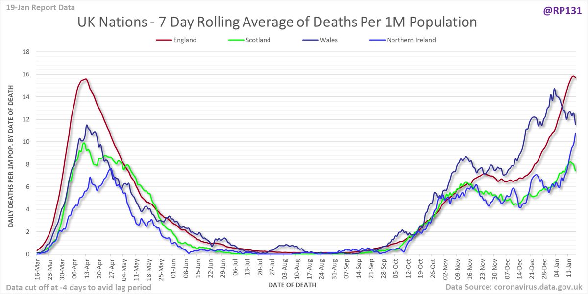 Full version since March of date of death chart for UK nations drawn with 7 day rolling averages of deaths per 1M population.