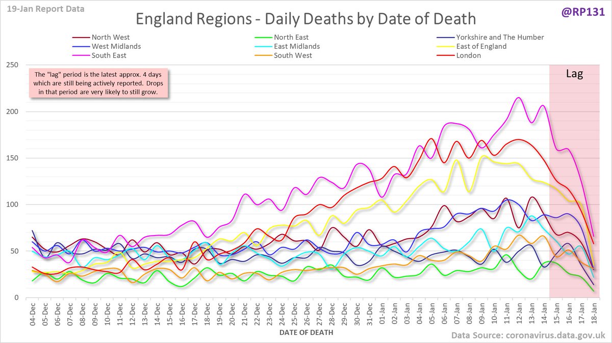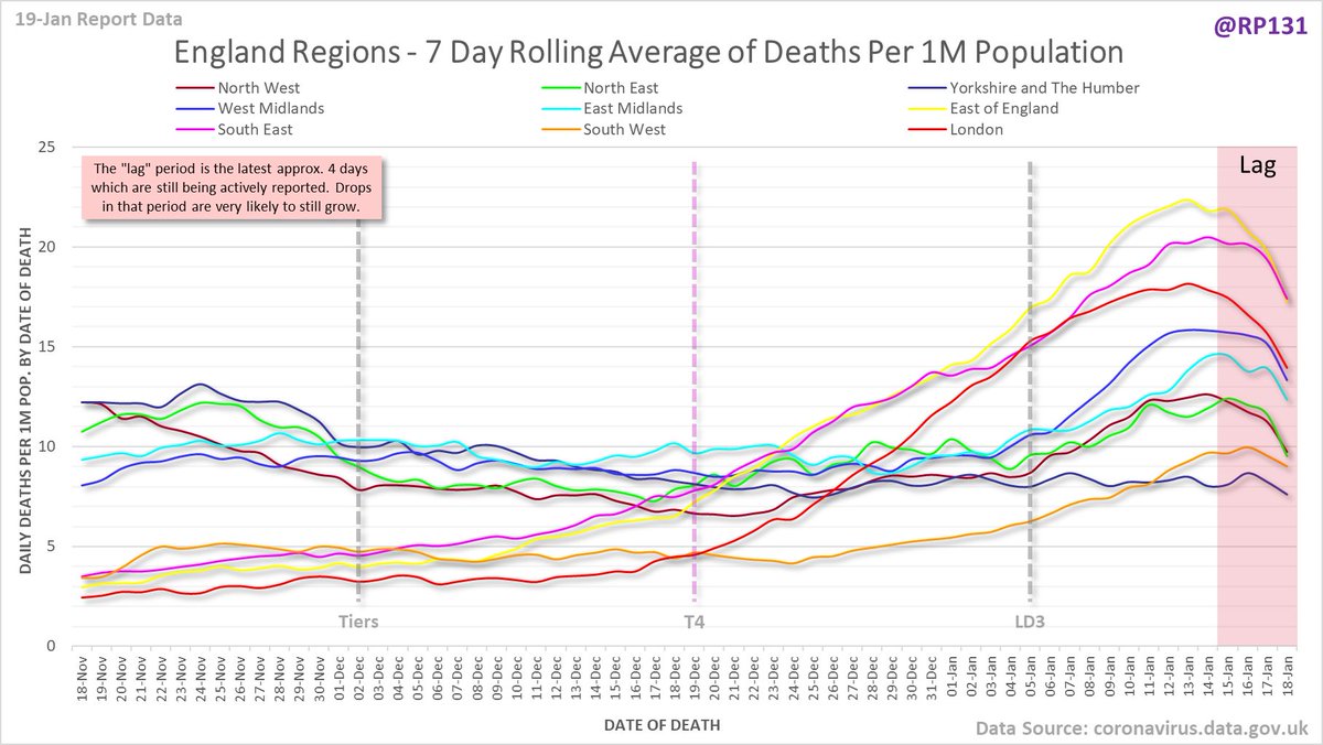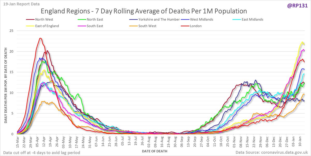 Full version since March of date of death chart for England regions drawn with 7 day rolling averages of deaths per 1M population.