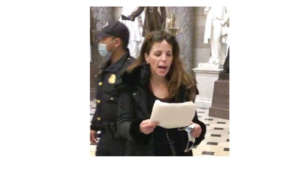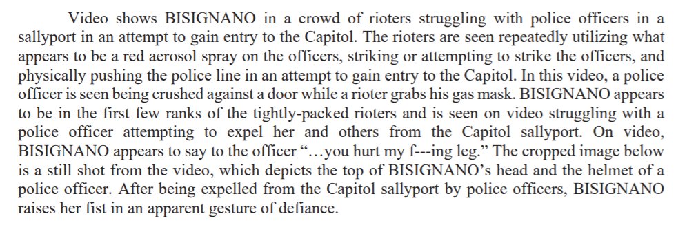 After being expelled from the Capitol sallyport by police officers---"You hurt my f---ing leg," she yelled at one--Bisignano raised "her fist in an apparent gesture of defiance."