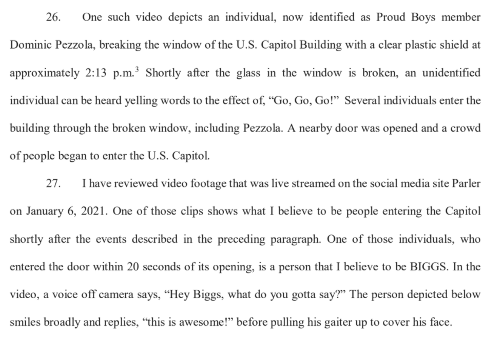 Biggs ultimately entered the Capitol, prosecutors say, adding that the other Proud Boys did so too. Among them was Dominic Pezzola, a PB and former Marine from Rochester who was charged last week.