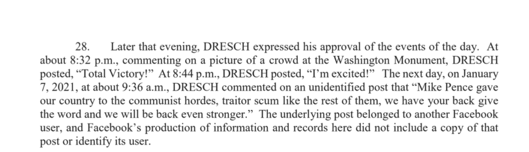 One day after storming the Capitol, Karl Dresch, of Calumet, Mich. commented on the FB page of a fellow insurrectionist, the FBI says.