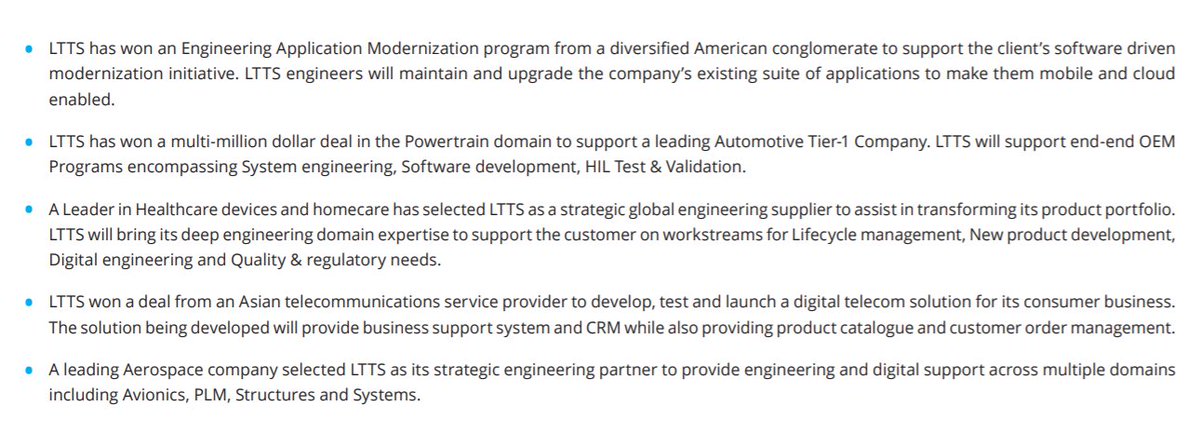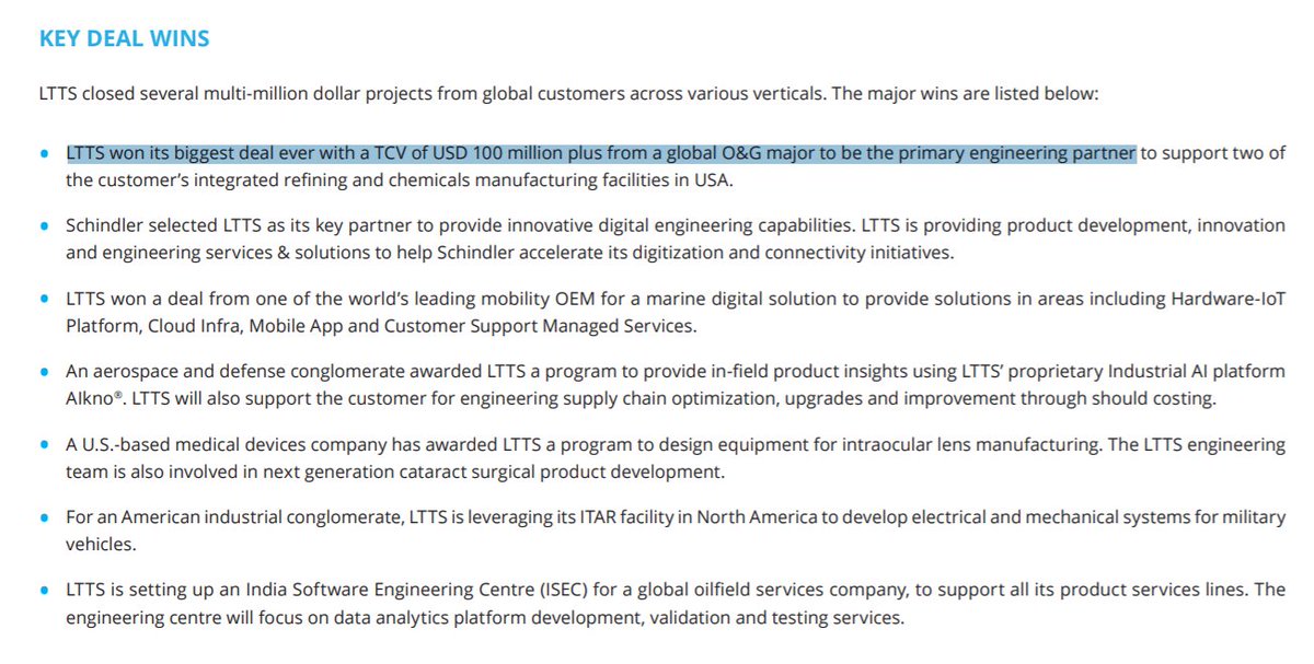 - Last quarter LTTS won its biggest deal ever with a TCV of USD 100 million plus from a global O&G major to be the primary engineering partner.