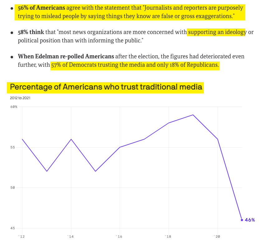 In extremely related news, a new poll today finds "Trust in traditional media has declined to an all-time low....For the first time ever, fewer than half of all Americans have trust in traditional media."