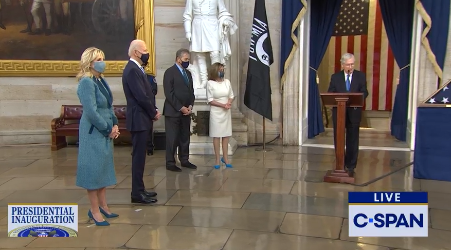 Two weeks ago, supporters of President Trump were starting their assault on the Capitol, ransacking parts of the historic building. Now, Congressional leaders are honoring the new President in the Capitol Rotunda, free from any attackers.