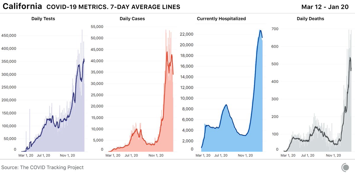 Our weekly update is published. Weekly cases are down 20%, and after 16 weeks of increases, weekly hospitalizations are down 4%. Yesterday’s record deaths brought the weekly total to 21,301―the 2nd highest number of deaths since the start of the pandemic. covidtracking.com/analysis-updat…