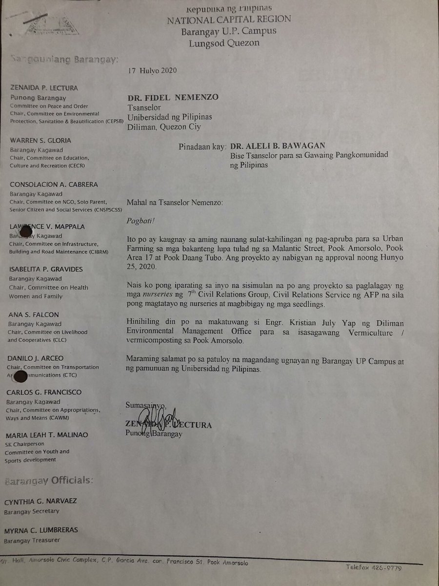 2) July 14, AFP wrote to inform them they would be conducting operations on that day til Aug7 on Pook Arboretum. Prior, AFP sought help from Sangguniang Brgy for the Raise to 1M project, “for which they have donated seedlings for our already existing Urban Gardens..” @ABSCBNNews