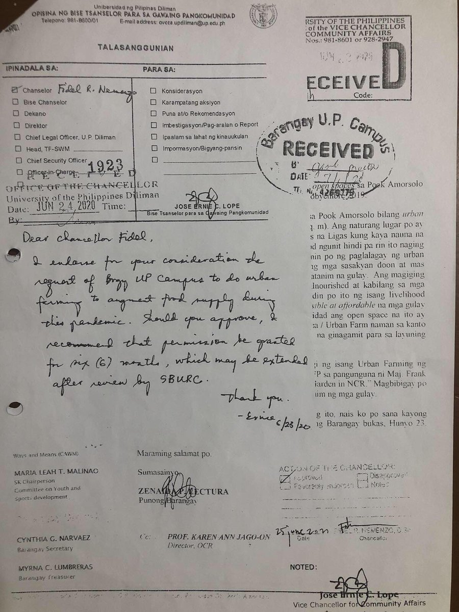 For their part, the Maj Sayson used these documents to justify their visit: 1st, a handwritten note sent to Chancellor Fidel Nemenzo on June24 2020, endorsing a request of Brgy UP Campus to make an urban garden “to augment food supy during the pandemic” for 6months @ABSCBNNews