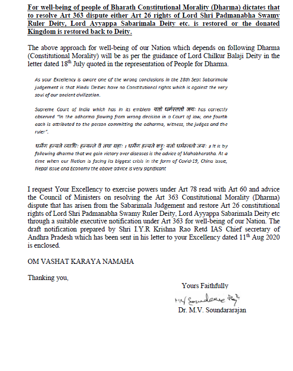 Above suggestion based on AP Founders Association rep to His Excellency @rashtrapatibhvn where Feb 10th adharmik dismissal of Lord Chilkur Balaji Deity petition to restore Art 26 Deity rights by SC has been identified as root cause for Delhi troubles w many protests incl farmers