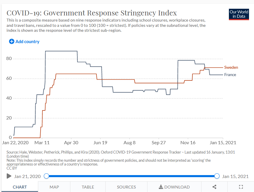 6/n Globalement les Suédois ont moins subi les angoisses des montagnes russe d'ordres et contre-ordres, et des restrictions brutales et généralisées aux déplacements et aux libertés.