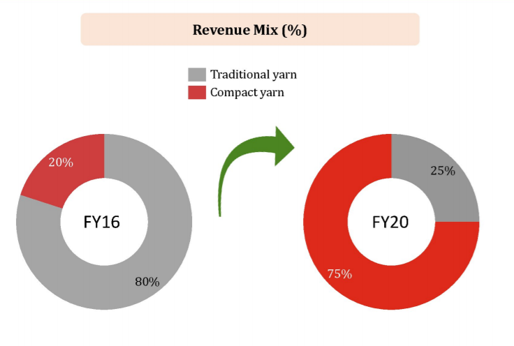 - Revenue mix from radiational and compact yarn is 16:84.