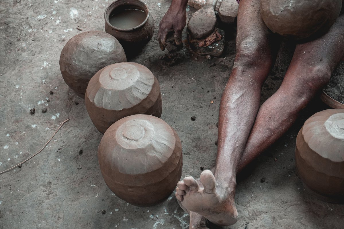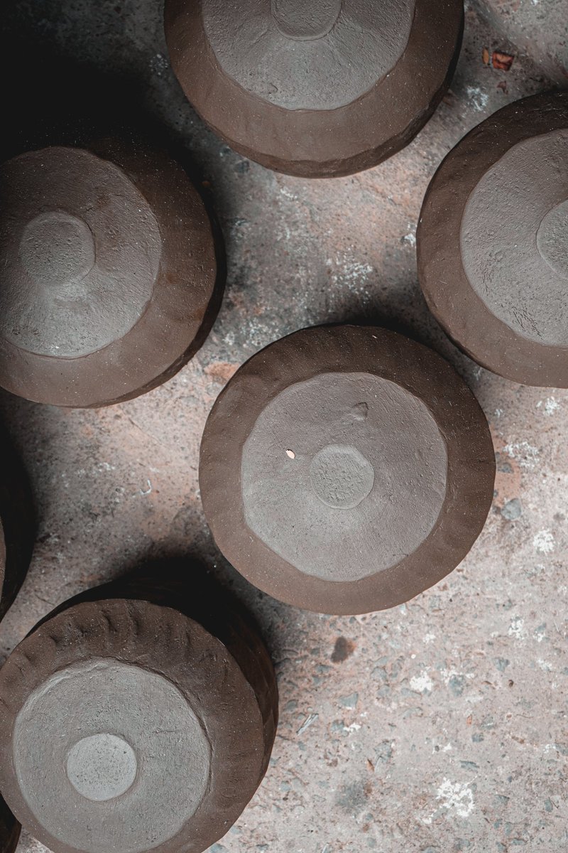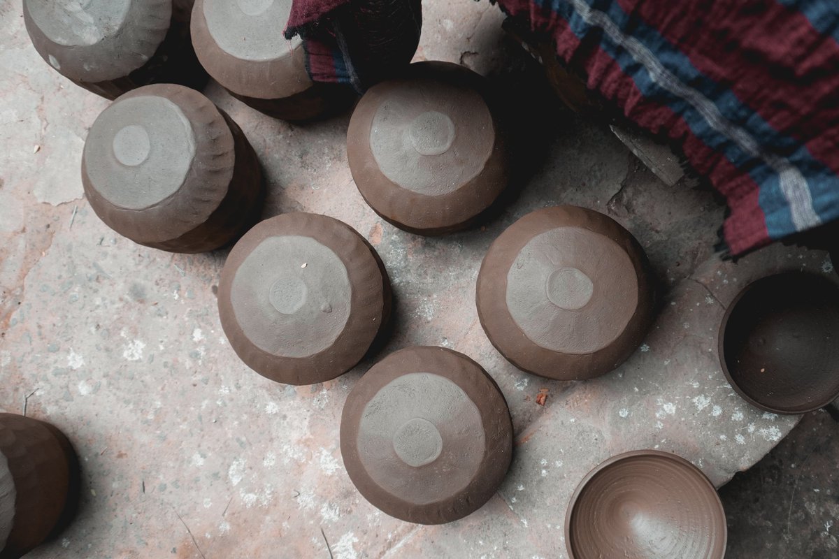 First made into pots without bases,the bases are attached to it later using special tools which are customer made for the job and a wooden bat to give it the surface that is typical to a Kudhua.