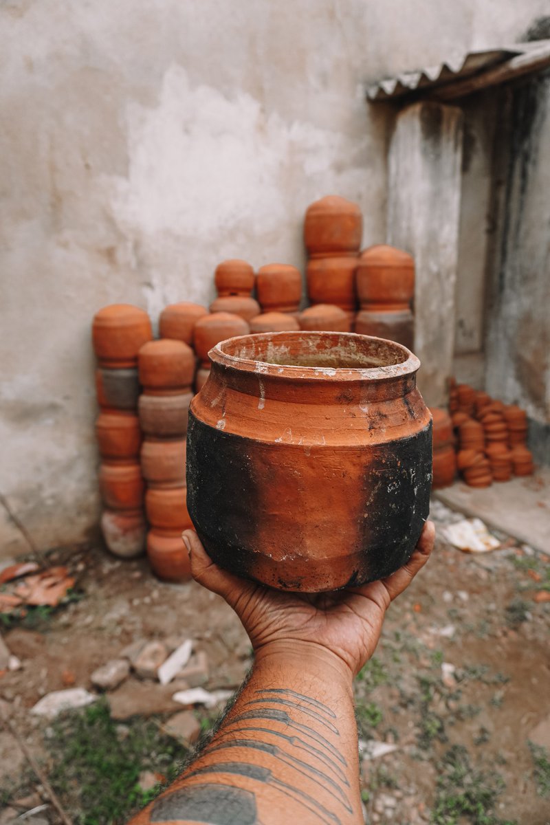 Once the perfect shape has been hand crafted,it's left to dry and then baked in traditional ovens using dried coconut husk and dried hay giving it their distinctive red colour.