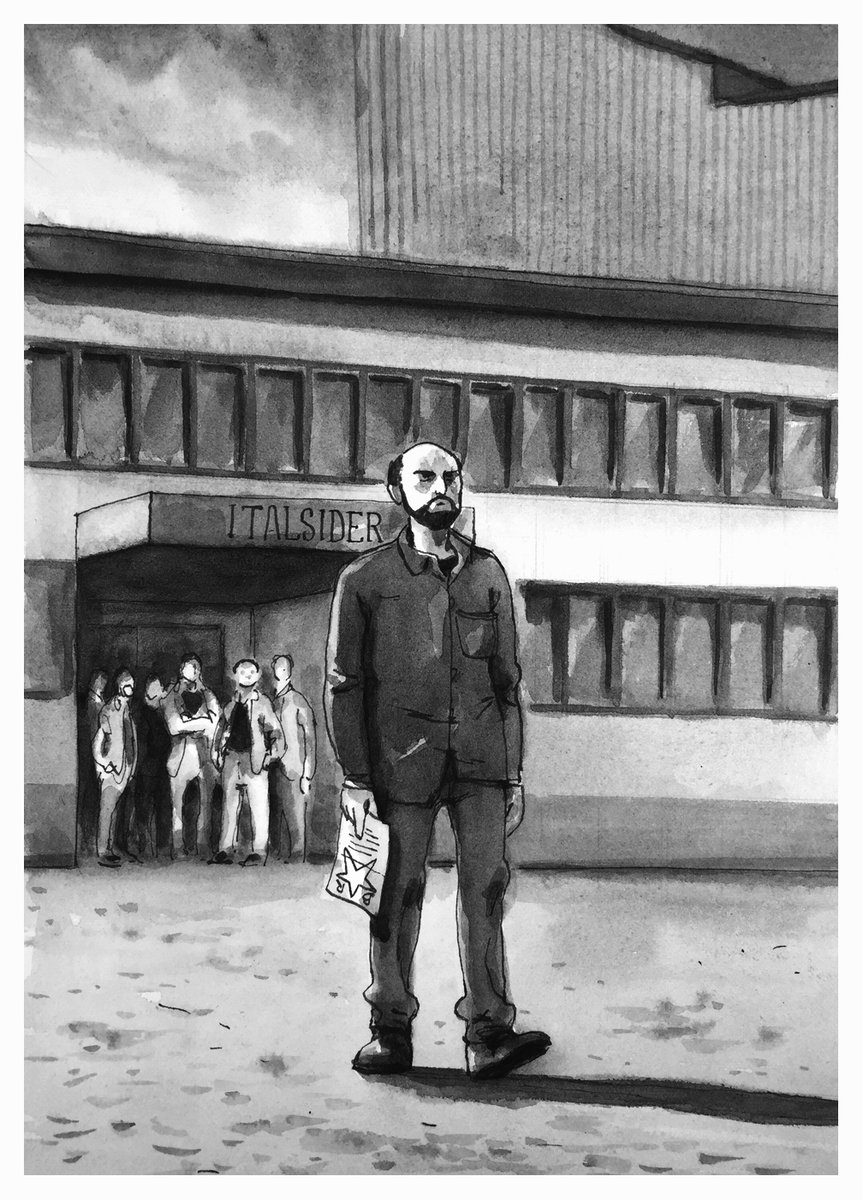 Guido, che è sindacalista, consegna i volantini al Consiglio di fabbrica.