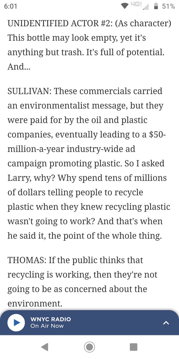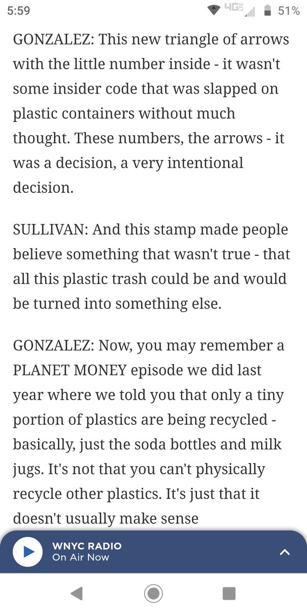 Yesterday, caught a repeat of this NPR story that blows the lid on plastic recycling. I've known about the futility of it for years thanks to an older longform. But had never thought of the plastic industry being THE champion of recycling. Machiavellian!