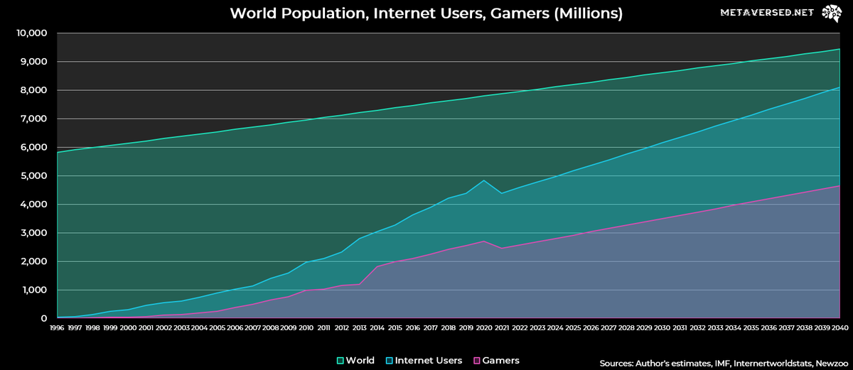 3/ The Metaverse is coming; trends indicate our direction of travel. Our next great milestone as a networked species awaits us: 7B digital souls with the option to exist almost exclusively online and participate in a virtual economy with societal impact.