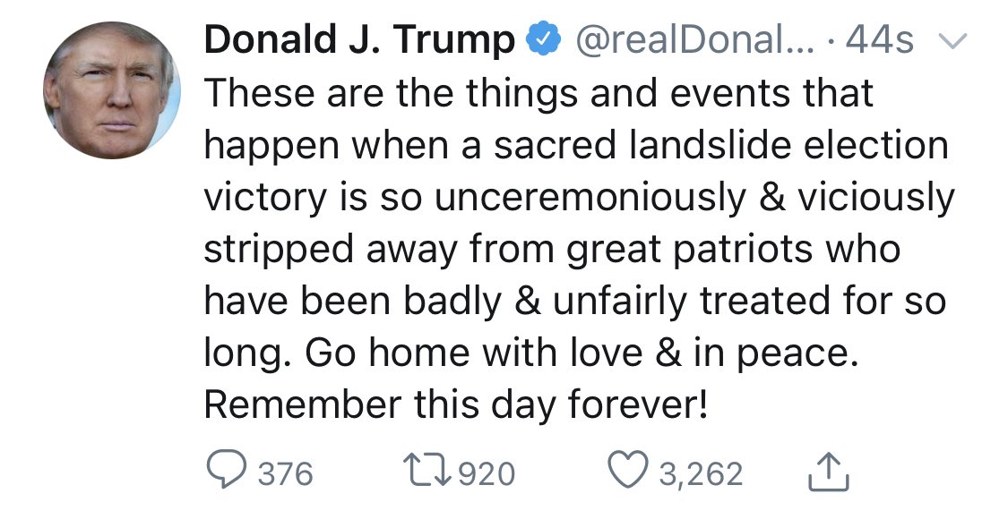The natural conclusion of this lie is what happened today. You cannot still be claiming the election was stolen and then also tell people to just go home. The end of this violence comes with the end of the lie about a stolen election.