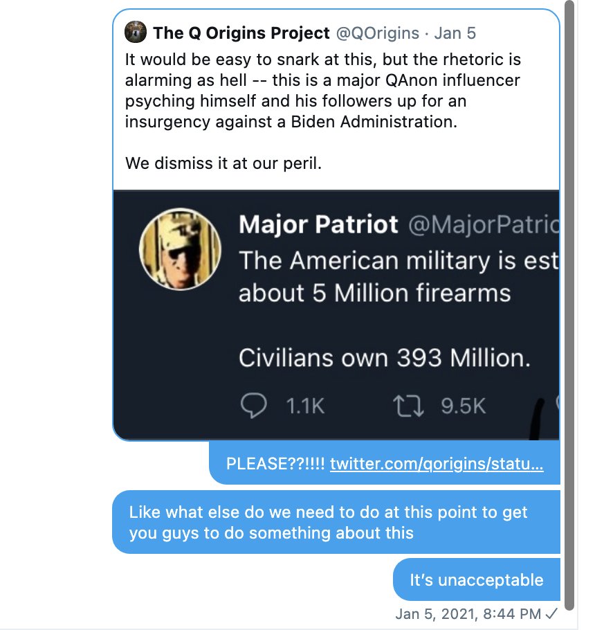 .@TwitterSafety Q influencers came back with new accounts mere hours after your sweep of mass bans on Friday. Q researchers found their new accounts within hours. @TwitterSafety either hire some of these people who can track these spaces better than you, or get better at ur jobs
