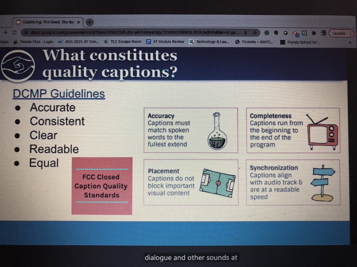 Accurate, consistent, clear, readable, equitable. Match spoken word, run start to end, don’t block content, aligns with audio and at readable speed. #atia2021