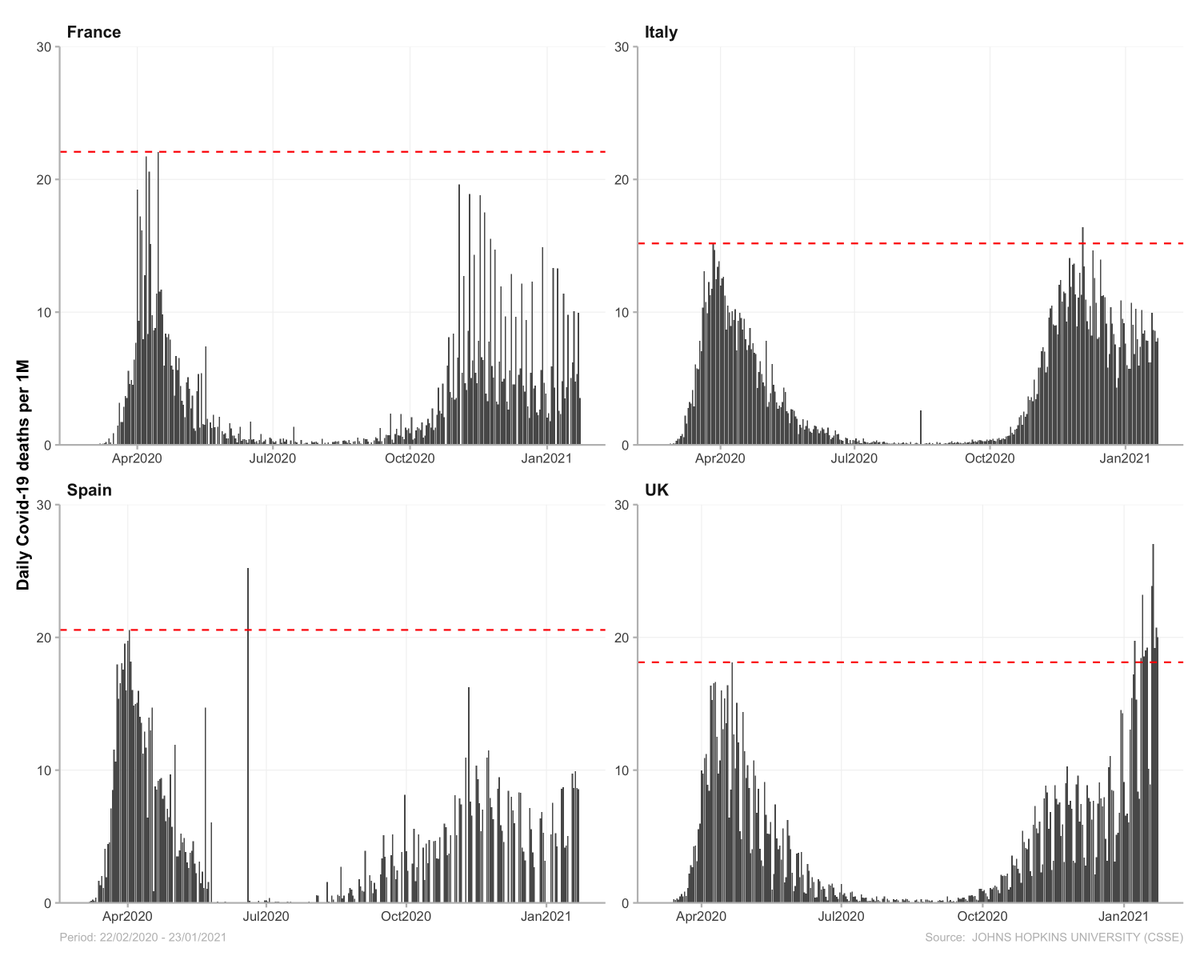 The UK has the worst Covid-19 situation in the world right now. A few graphs to compare it to other countries: The increase in deaths in last 14 days is the highest in the world, followed closely by Portugal (although the latter has much less deaths per capita overall) [1/3]