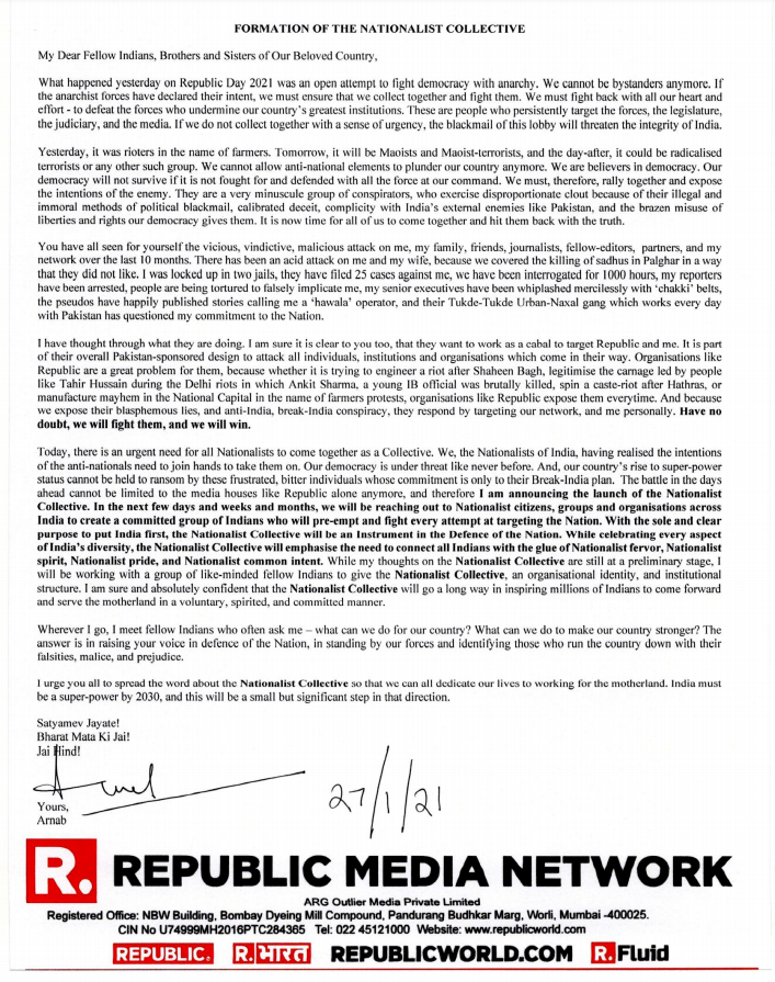 Arnab: While my thoughts on the Nationalist Collective are still at a preliminary stage, I will be working with a group of like-minded fellow Indians to give the Nationalist Collective, an organisational identity, and institutional structure. 20/n @NationalistCol