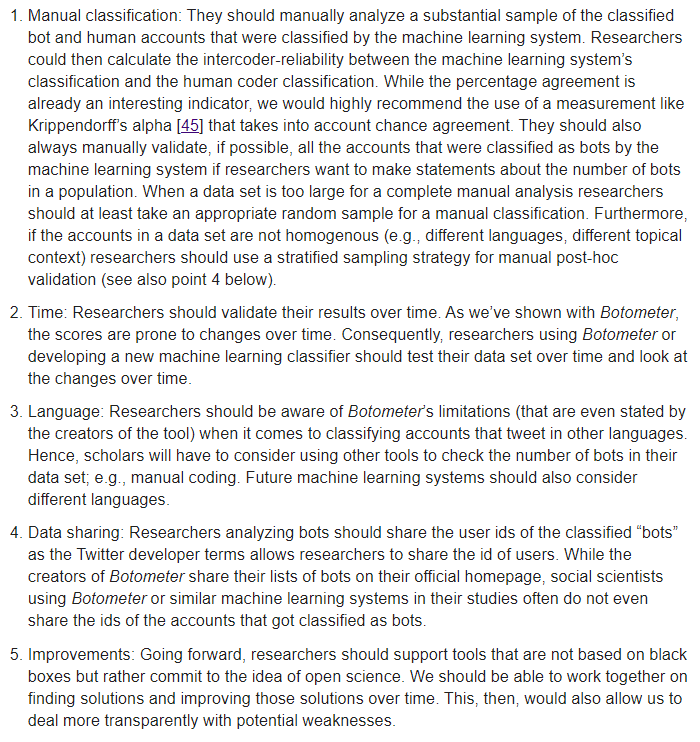 Their approach is even questioned by the creators of the detection tool (@Botometer)👇. We show in our own paper that with thresholds (also the one used in the Brown study) researchers will end up with a high number of false-positives and thus overestimate the number of bots. 3/7