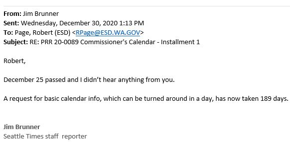 On June 24, 2020, I emailed a records request to @ESDwaWorks for "a complete copy of [ESD Commissioner] Suzi LeVine's calendar from Jan. 1, 2020 through May 31, 2020."