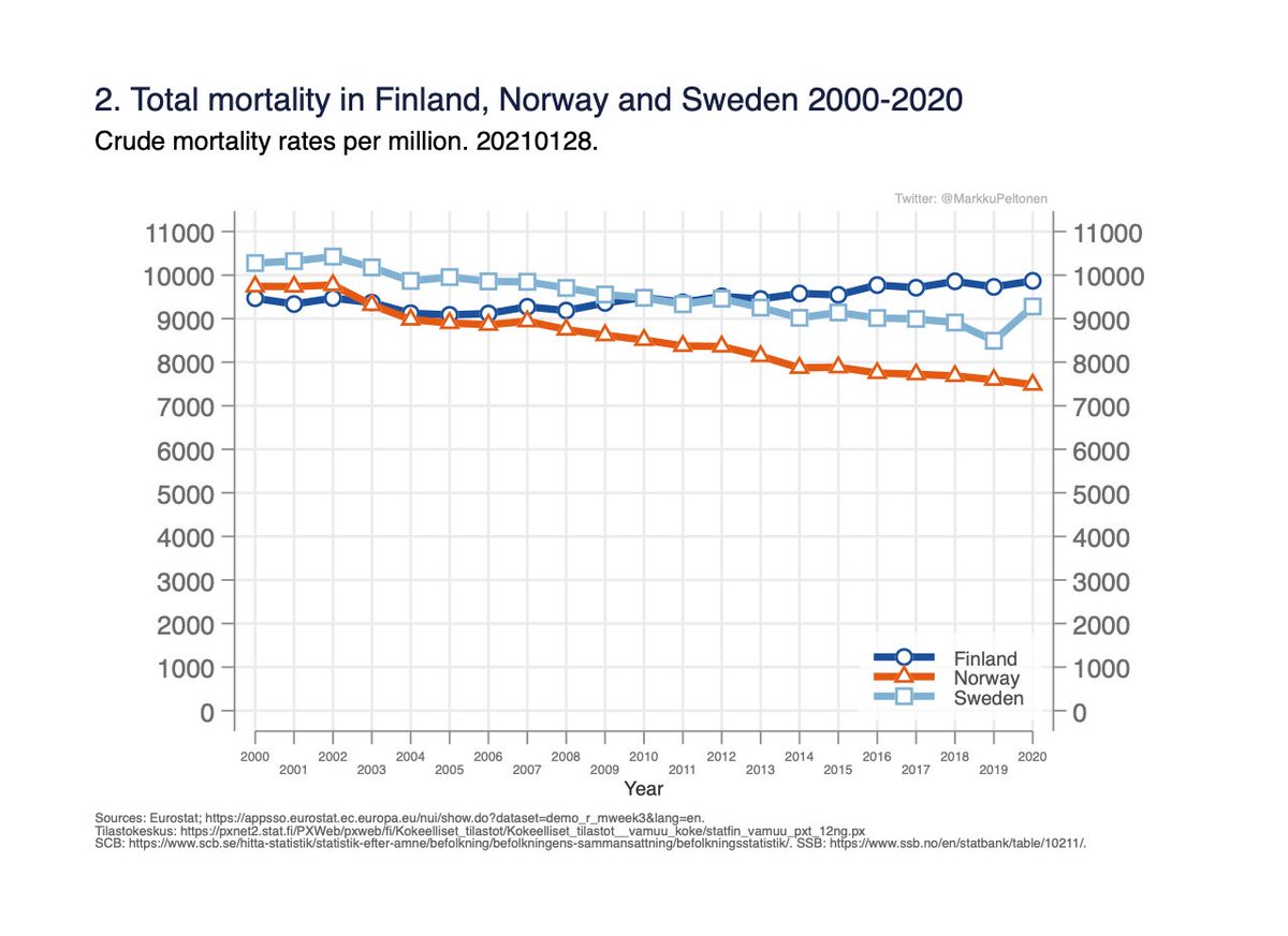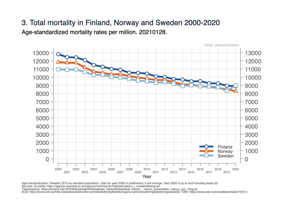 As 2020 prelim. total mortality data now reasonably complete, here is an update on the age-standardised analysis for 2000-2020 for Finland Norway Sweden.