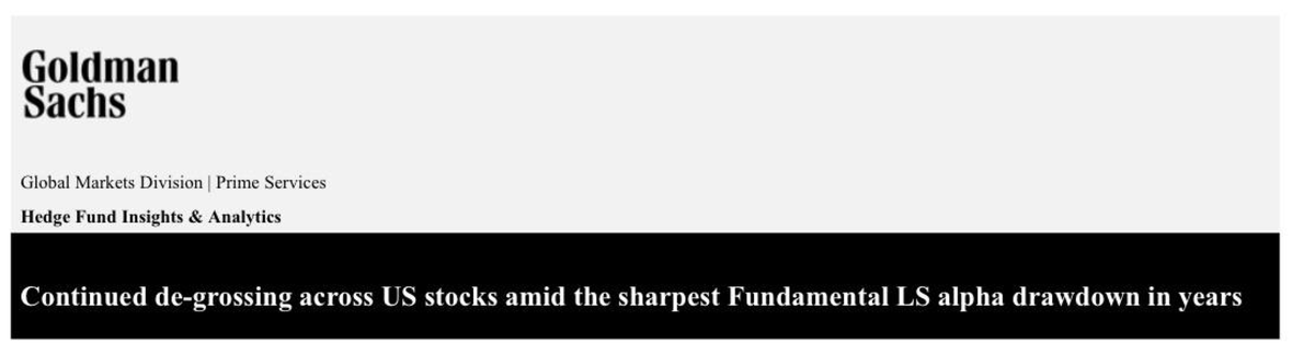 According to Goldman Sachs, Hedge funds are "de-grossing" (selling longs, covering shorts) amidst the sharpest Fundamental Long/Short alpha drawdown in years