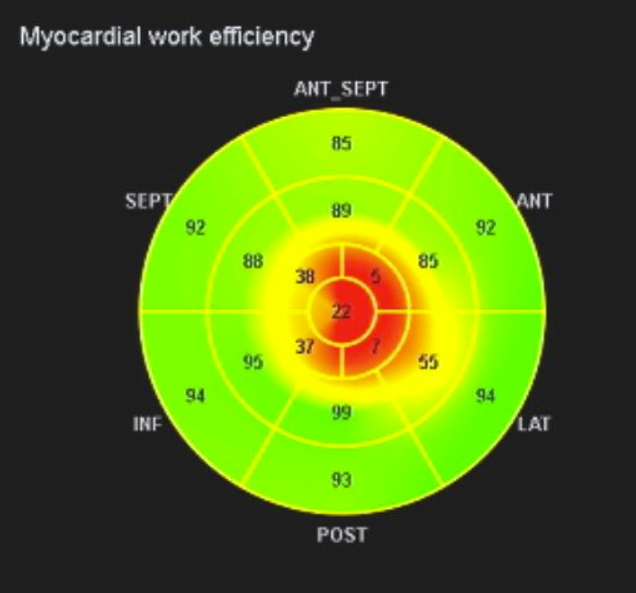 5/5 Bullseye strain is typical of apical aneurysm with dyskinesis shown in deep blue. Global work efficiency is markedly decreased at 66% due to apical dyskinesis.