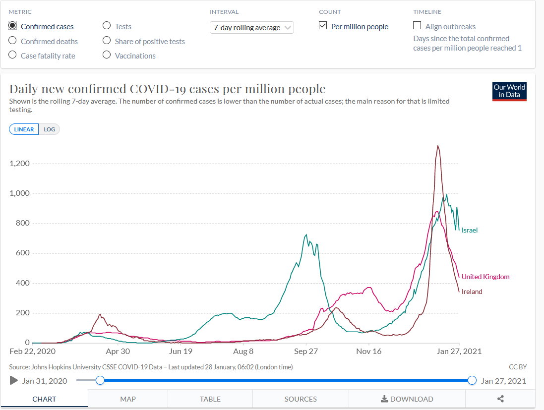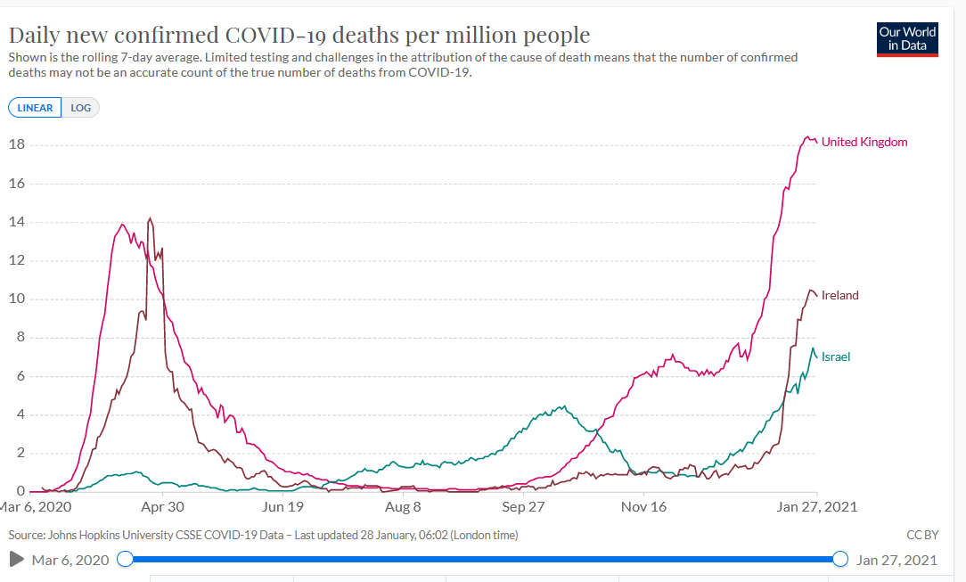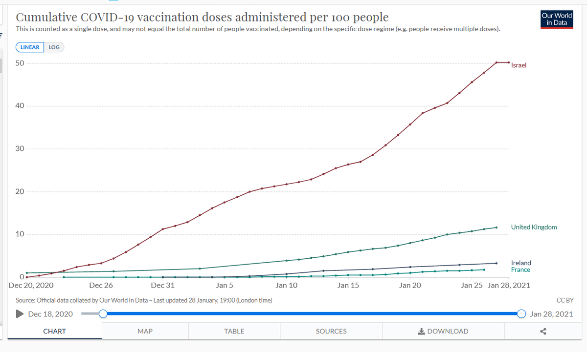 Or, alors que Israel a priorisé les EHPAD, les plus de 60 ans , les fragiles et les soignants qui étaient vaccinés par une première dose tt début janvier où 12% de la pop avait été vaccinée, cela ne se voit pas du tout.