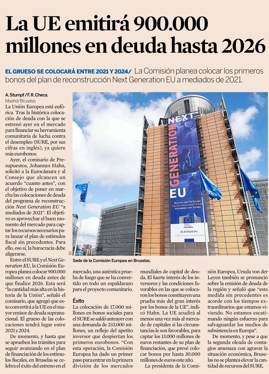 Ayer tuvimos avalancha en la deuda (y yo mucho trabajo). No es casualidad y da cuenta del buen momento del mercado. Primero la Comisión Europea celebraba el éxito histórico de su primera colocación de bonos y anticipaba su estrategia de emisión. Con @frcheca