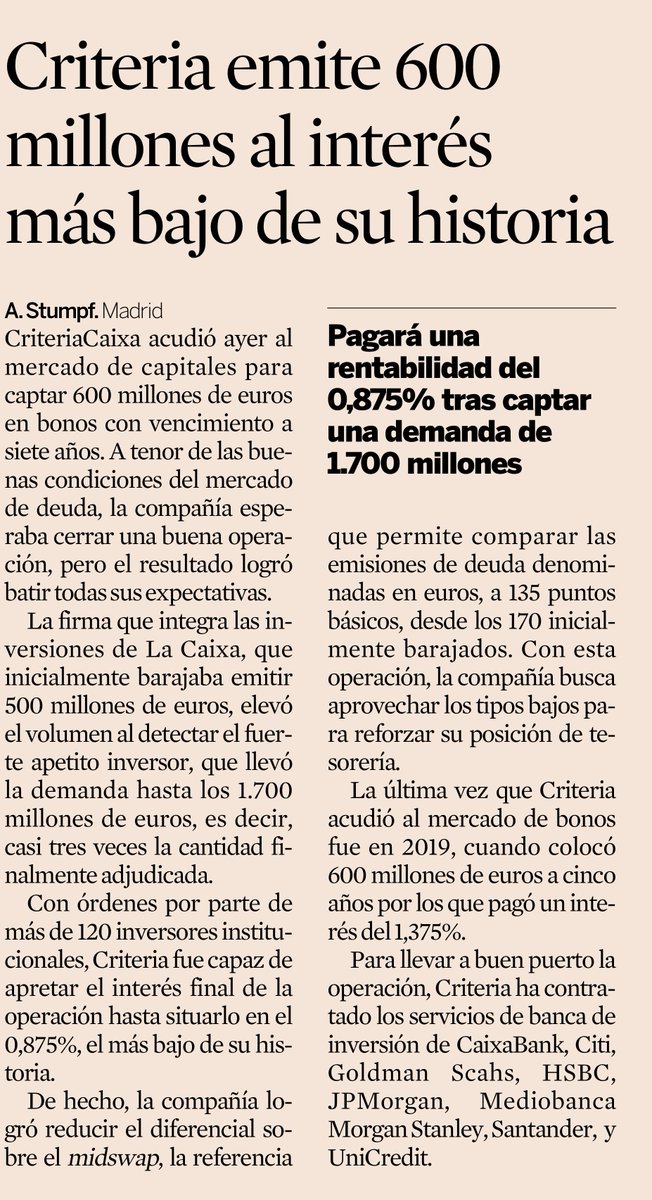 Además, Criteria, holding de inversiones de La Caixa, colocaba 600 millones de euros en bonos al interés más bajo de su historia