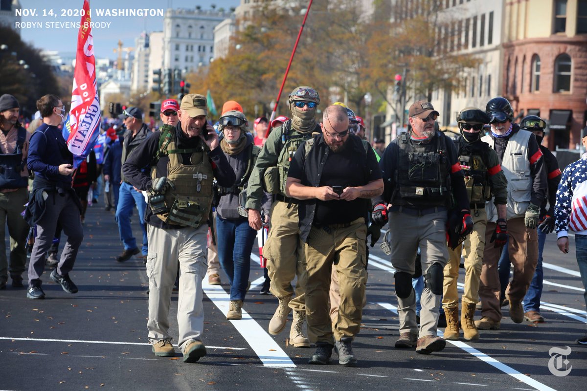 The earliest we see them is between 9 and 10 a.m., in this photo by @WilliamTurton, when they arrive for Trump’s speech. Note: Most of them are not wearing tactical gear.