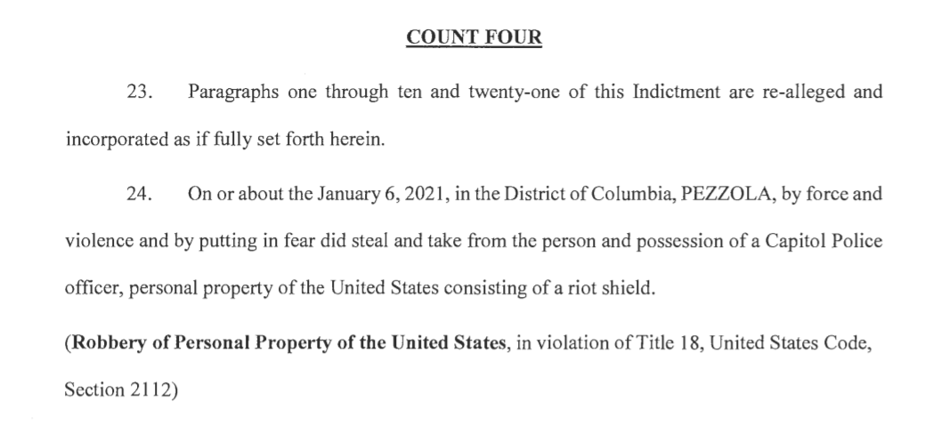The feds clearly say here that Pezzola stole the riot shield he used to smash a Capitol window from a cop.