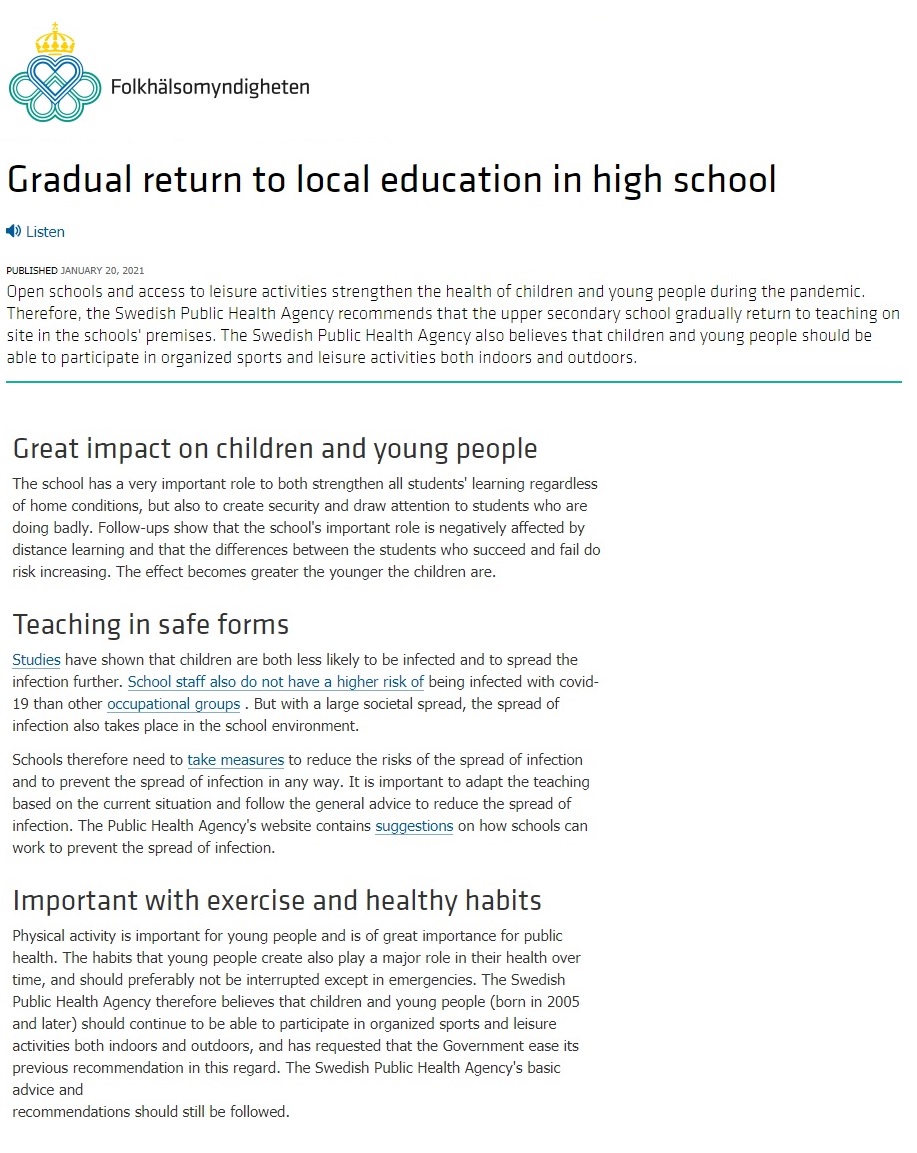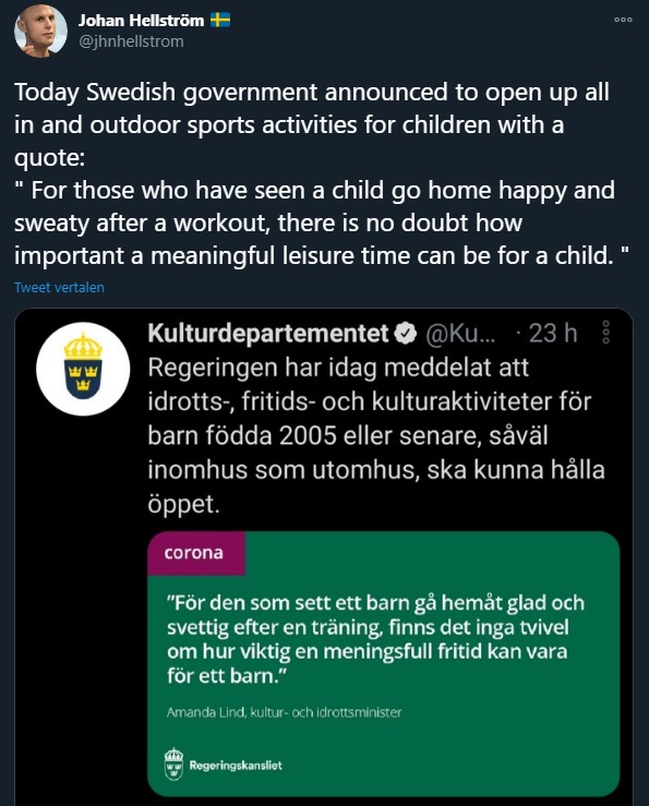 Een wereld van verschil. "Open schools and access to leisure activities strengthen the health of children and young people during the pandemic." Was getekend: Folkhälsomyndigheten, de Zweedse gezondheidsautoriteiten. folkhalsomyndigheten.se/nyheter-och-pr…