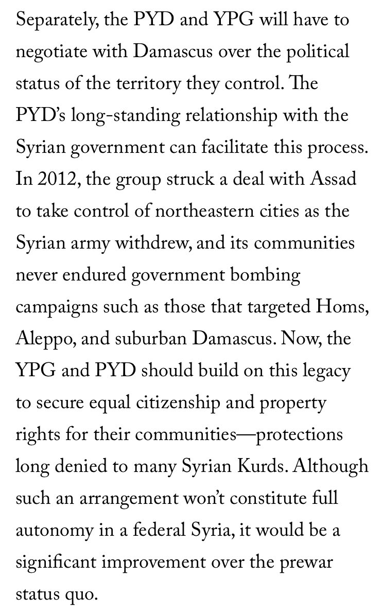 6/ Short of a comprehensive strategy on Syria, US officials basically told the PYD «we won’t oppose a PYD/Regime deal», which is neither exactly a «regime change» attitude nor a proactive policy. Rather the acknowledgment of US inability to give polit guarantees to the Kurds.