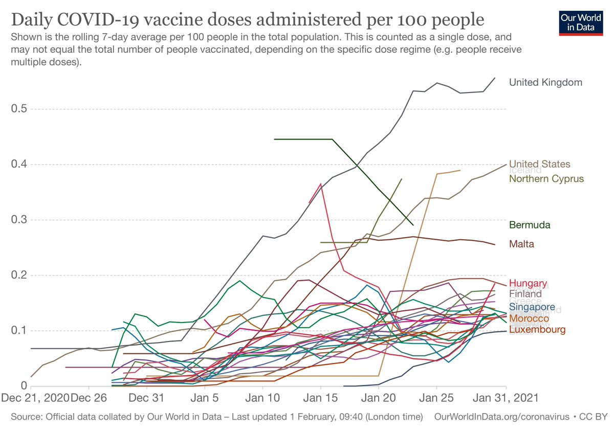 Alguns vão dizer que é porque começamos mais tarde, não é. Mesmo em doses por dia ainda estamos bem atras, entregando 0,1% de doses por população por dia, tão pequeno que não da para achar no gráfico ico comparativo.