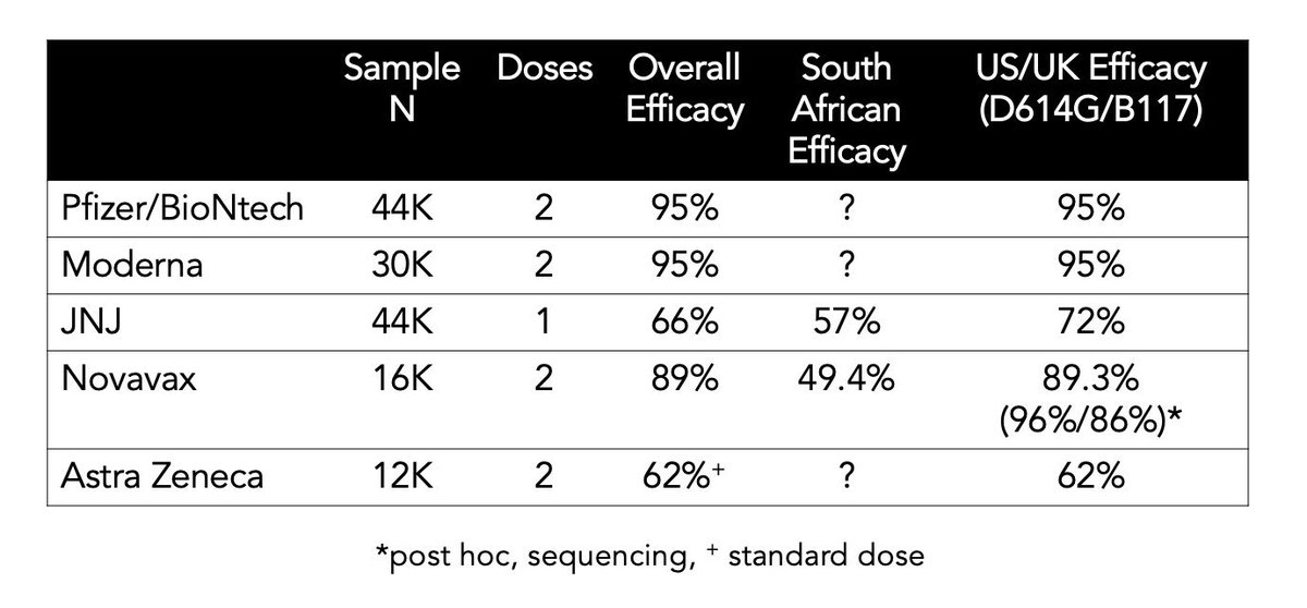 4-Pero el dato mas importante de las vacunas es este: mas de 75,000 personas han recibido la 💉 en los diferentes estudios de las famaceuticas. Eficacia para ⬇️ riesgo enfermedad moderada/severa es de 95 a 60% dependiendo la vacuna o el sitio del estudio. Tabla Dr @EricTopol