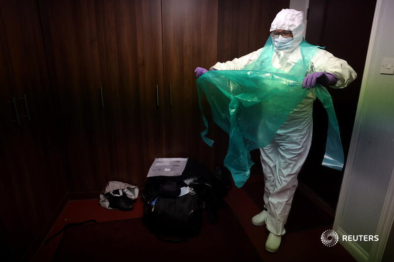 @hannahmckay88 Embalmer Mary Evans wears heavy-duty PPE as she prepares an elderly COVID victim, and doesn't move the body more than necessary in case the lungs expel infected air droplets 5/7