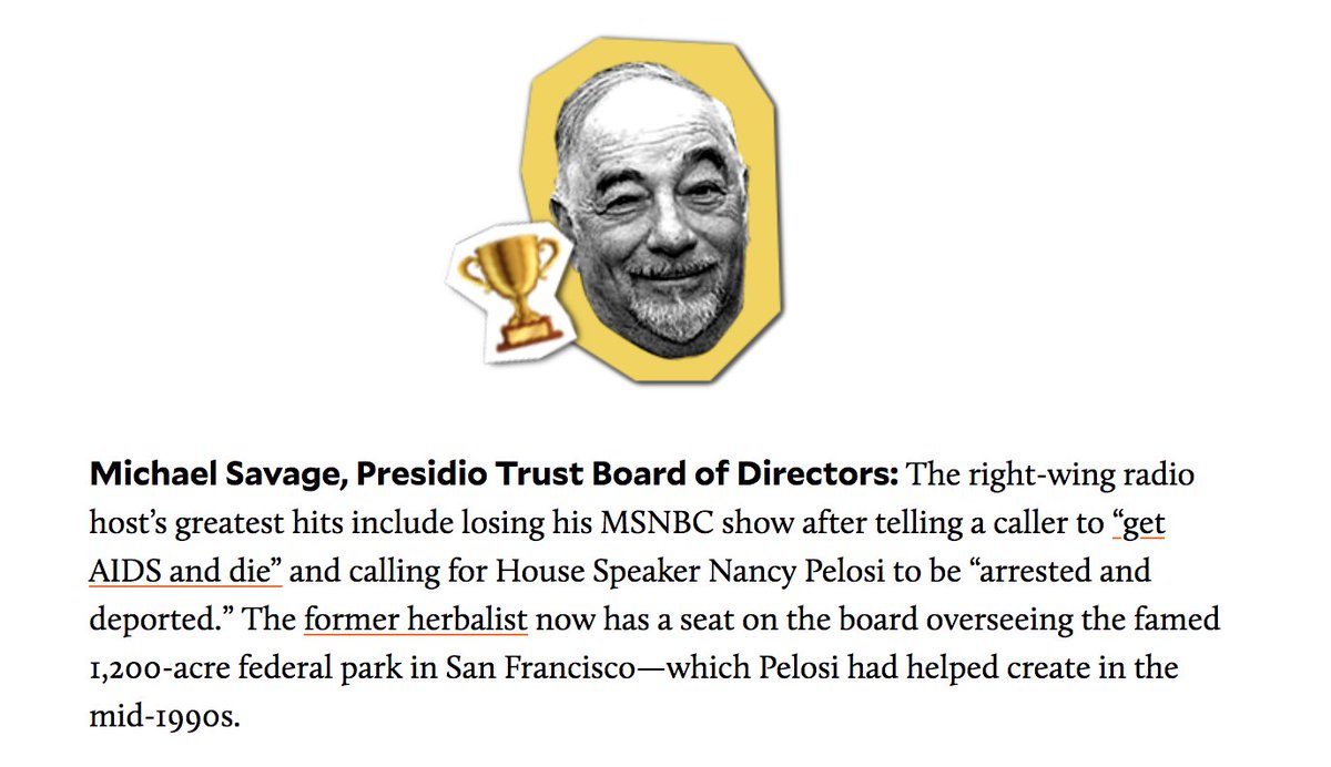 The right-wing radio host’s greatest hits include losing his MSNBC show after telling a caller to “get AIDS and die” and calling for Nancy Pelosi to be “arrested and deported.” He now has a seat on the board overseeing the Presidio in San Francisco.