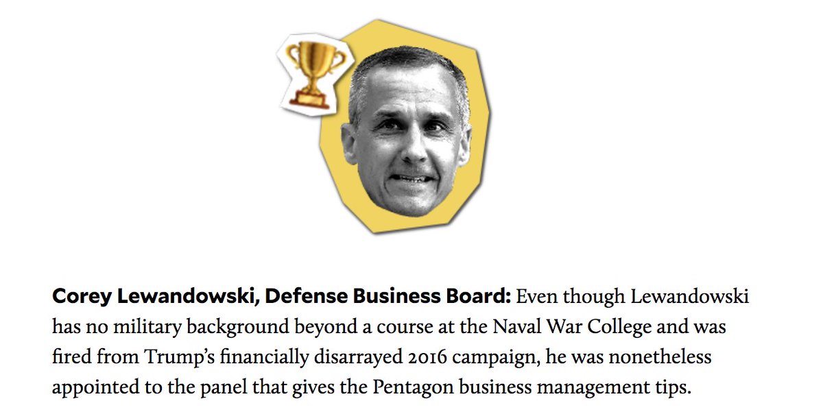 Even though Lewandowski has no military background beyond a course at the Naval War College and was fired from Trump’s financially disarrayed 2016 campaign, he was nonetheless appointed to the panel that gives the Pentagon business management tips.